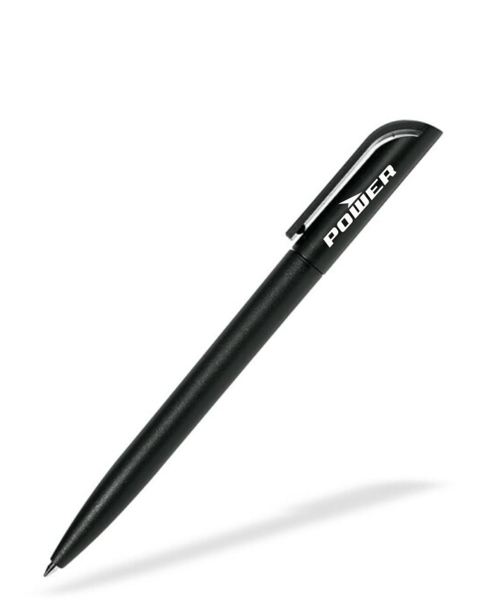 Kulspetspenna med vidmekansim. Penna i slagtålig ABS plast som levereras med en plastjumbopatron med blått bläck.